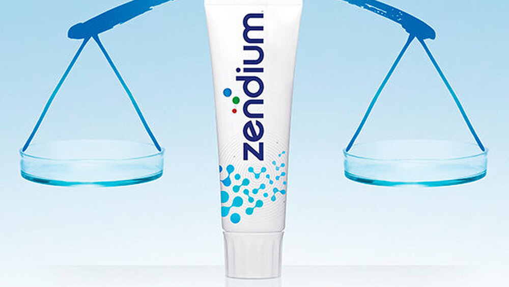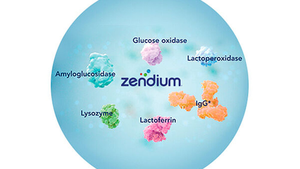 Die fluoridhaltige Zahnpasta Zendium wurde entwickelt, um mit Hilfe von Proteinen und Enzymen das mikrobielle Gleichgewicht im oralen Biofilm zu erhalten und die natürliche Schutzfunktion des Speichels zu stärken. Seine antimikrobielle Wirksamkeit entfaltet Zendium dabei über sein Dreifachenzymsystem, das die Bildung von antibakteriell hochwirksamem Hypothiocyanit fördert. Zusätzlich wird das Bakterienwachstum reguliert, indem eine Dreifachproteinkombination aus Lysozym, Lactoferrin und dem Immunglobulin IgG(1) das im Speichel natürlich arbeitende Laktoperoxidase-System unterstützt.