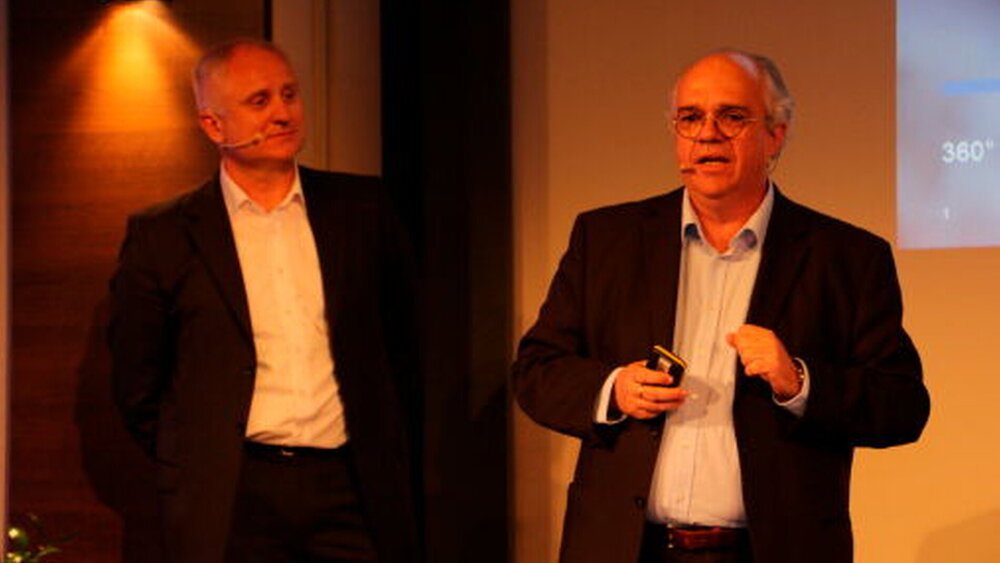 Im Anschluss präsentierten Peter Fornoff und Hans-Georg Bauer aus Sicht der Firmenforschung und des Firmen-Marketings bei Sirona Dental: CAD/CAM-Perspektiven für das zahntechnische Labor. Optionen von (CAI) Scannen, Software (CAD), dem Schleifen, Fräsen und Sintern stellten die beiden Führungskräfte vor. Und Bauer erläuterte vor dem Auditorium noch einmal die Eckpunkt des Zusammengehens von Dentsply und Sirona, die als zwei gleichwertige Firmen diese Fusion gestaltet hätten.