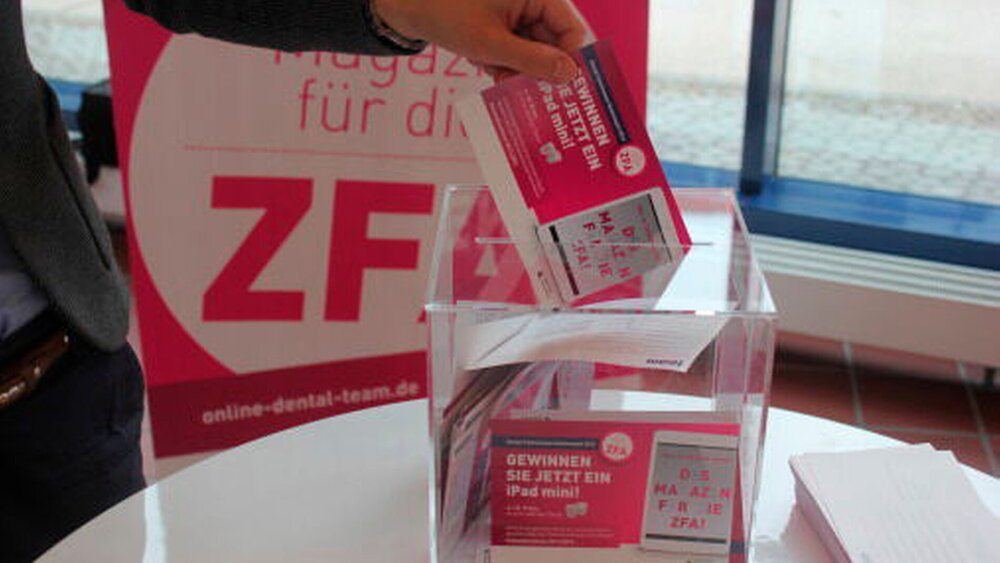 Der Deutsche Ärzte-Verlag begrüßte die Besucher direkt nach dem "Check-In" mit einem attraktiventeam-Gewinnspiel. Unter allen Teilnehmern wird ein iPad mini verlost, dementsprechend groß war der Andrang. Die Medienteamund DENTAL MAGAZIN wurden ebenfalls präsentiert.