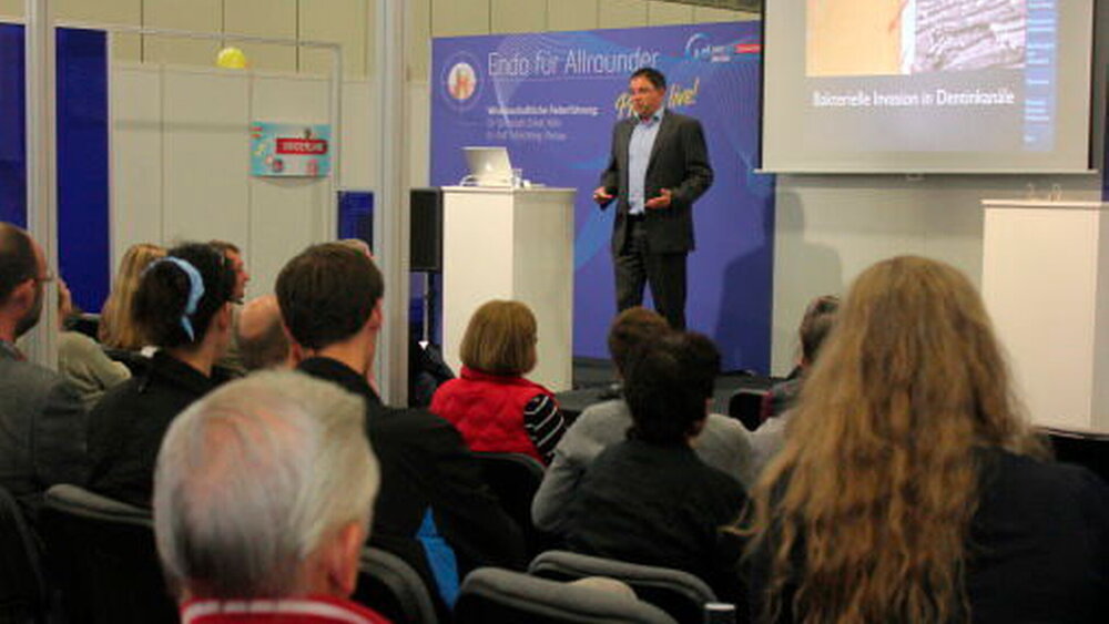 In der Dental-Arena konnten sich Zahnärzte im Bereich der Endodontie auf den neuesten Stand der Wissenschaft bringen. Dr. Ralf Schlichting, Vorstandsmitglied der DGET, stellte in seinem Vortrag die Schritte vor, die für eine erfolgreiche Endodontiebehandlung erforderlich sind - von den mikrobiologischen Grundlagen bis hin zur post-endodontischen Versorgung.