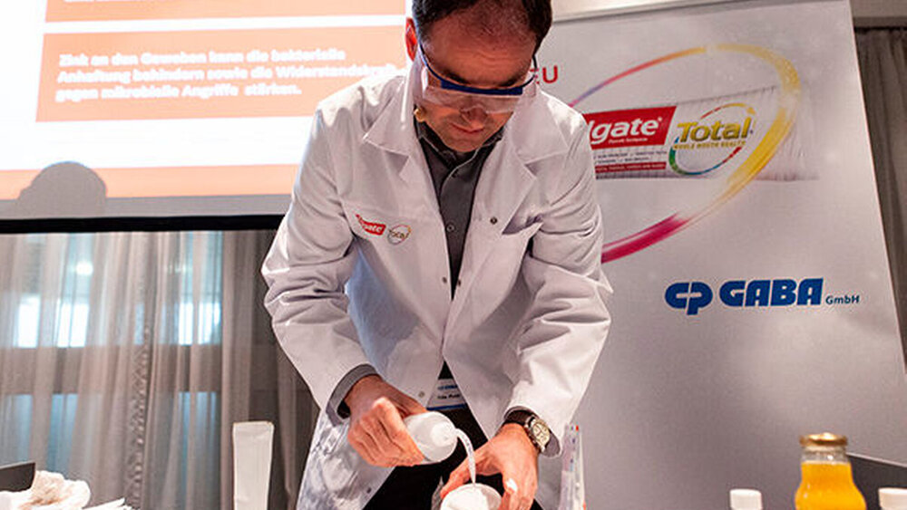 Dr. Marianne Gräfin Schmettow, Leiterin Scientific Affairs D-A-CH bei Colgate-Palmolive Services CEW GmbH, präsentierte den geladenen Fachjournalisten im Rahmen der Pressekonferenz umfangreiche Studienergebnisse, die eindrücklich das breite Spektrum an Vorteilen der neuen Zahnpasta für den Rundumschutz für den ganzen Mund belegen. Durch Live-Demonstrationen von Tilo Poth, Manager GTC Therapeutic and Professional Products, Colgate-Palmolive Company, konnten die etwa 30 Gäste die Technologie der Zahnpasta unmittelbar in Aktion erleben.