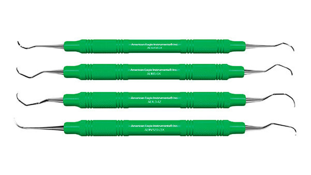 Alle vier Instrumente von American Eagle haben abgerundete Arbeitsenden, um Kratzer im Implantat zu verhindern. Der Behandler profitiert von leichten, ergonomischen Griffen aus EagleLite Kunststoff, was die Hände spürbar entlastet. Der Scaler 204S ist für den Molarenbereich gedacht und stark abgewinkelt, um den Zugang zu vereinfachen. Die N 128/Langer 5 Kombination ist ein modifizierter Sichelscaler plus Universal-Frontzahnkürette für den Ober- und Unterkiefer. Die Spitze Nebraska 128 ist ideal für kleine, enge Bereiche und die Peripherie des Implantataufbaus. Die Langer 3-4 Universalkürette imitiert die Schaftwinkelung der Gracey 13-14, eine gute Wahl für die Behandlung von Zahnersatz im Molaren- oder Prämolarenbereich. Erhältlich ist darüber hinaus eine Barnhart 5-6 Universal-Kürette. Die Implantatinstrumente gibt es einzeln oder als Set mit Kassette.