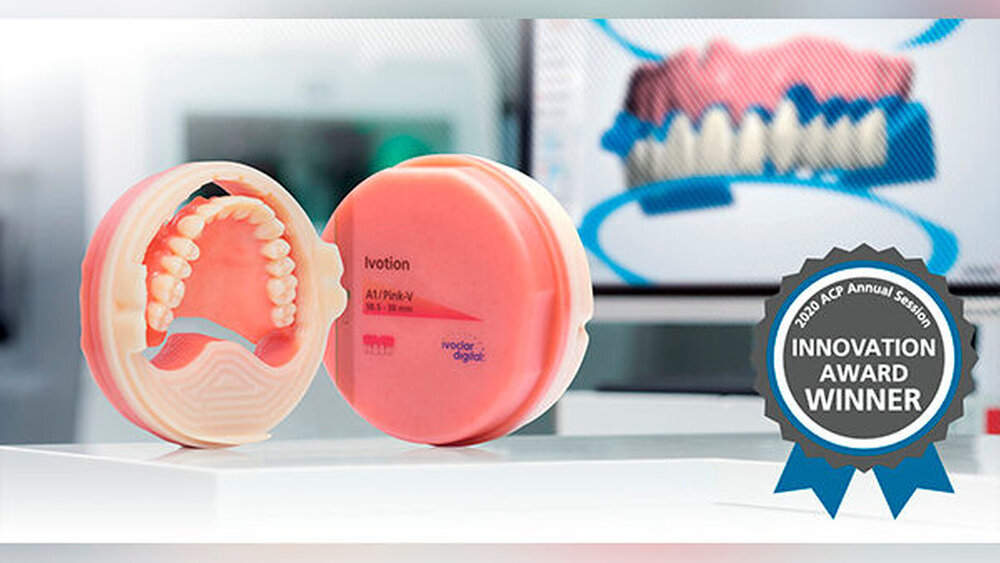 An der virtuellen Jahrestagung des ACP unter dem Motto "Evolution und Revolution in der zahnärztlichen Prothetik" wurden vom 1. bis 7. November 2020 die neuesten Dentalprodukte von elf Dentalunternehmen in einem virtuellen Innovationsschauraum präsentiert. Die Teilnehmenden waren eingeladen, die neuesten Produktinnovationen zu erkunden und ihren Favoriten zu wählen. Dabei fiel die Wahl auf das Ivotion Denture System als Top-Produkt.