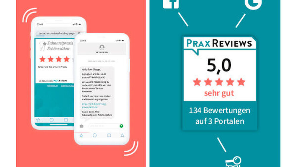 Eine zukunftsorientierte, innovative Lösung bietet die Software-Lösung PraxReviews. Mit PraxReviews können Praxisinhaber ihre Patienten per SMS dazu auffordern, den vorangegangenen Praxisbesuch zu bewerten. Außerdem bietet PraxReviews die Möglichkeit, die Online-Reputation in einem einzigen Siegel zu bündeln. So wird eine Durchschnittsnote angezeigt, die sich aus den Bewertungen aller bekannten Online-Portale wie Google, Jameda, Die Arztempfehlung usw. zusammensetzt.