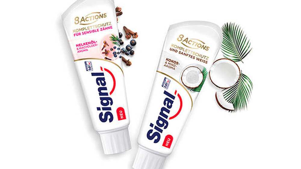 Gerade wurde die Signal-Familie um die Signal 8 Actions Varianten erweitert. Sie bieten den kompletten Schutz eines 8-fach-Wirksystems: Kariesschutz, Zahnfleischstärkung, 18 Stunden Anti-Plaque-Effekt, Zahnschmelzstärkung, natürliches Weiss, frischer Atem, gegen Zahnsteinneubildung und Bekämpfung von Bakterien. Erhältlich sind die Signal 8 Actions als „Komplettschutz und sanftes Weiss mit Kokos- und Minz-Aroma“ sowie „Komplettschutz für sensible Zähne mit Nelkenöl- und Wacholder-Aroma“ – mit Kalium für sensible Zähne. Wirksame Zusätze wie Zink für eine antibakterielle Wirkung und Fluorid komplettieren diese zwei neuen Geschmacksrichtungen. Jörg Westhues: „Signal stellt hier einmal mehr seinen herausragend guten Geschmack unter Beweis – mit trendigen Aromen und Geschmacksvarianten sowie in der Zahnpflege. Die neuen Signal 8 Actions bieten kompletten Schutz für gesundes Zahnfleisch und gesunde Zähne – weil jedes Lächeln zählt.“