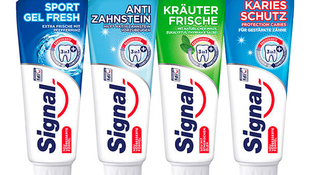 Seit fast 60 Jahren überzeugt die Zahnpasta Signal mit hoher Qualität, unkomplizierter Zahnpflege, unwiderstehlichem Geschmack und einem ausgezeichneten Preis-Leistungsverhältnis. Entsprechend präsentiert sich die Zahnpasta heute in einem neuen und frischen Look. Mit ihren überarbeiteten, milderen Formulierungen mit Fluorid sowie einer „3 in 1 Wirkung“ bietet sie alle Eigenschaften, die eine gute Zahnpasta haben muss: langanhaltender Schutz vor Karies, Schutz vor versteckten Zuckersäuren sowie Stärkung und Schutz des Zahnschmelzes. Die Traditionsmarke Signal aus dem Hause Unilever bietet damit hochwirksamen, geschmacklich vorzüglichen und preiswerten Schutz für Zähne und Zahnfleisch.