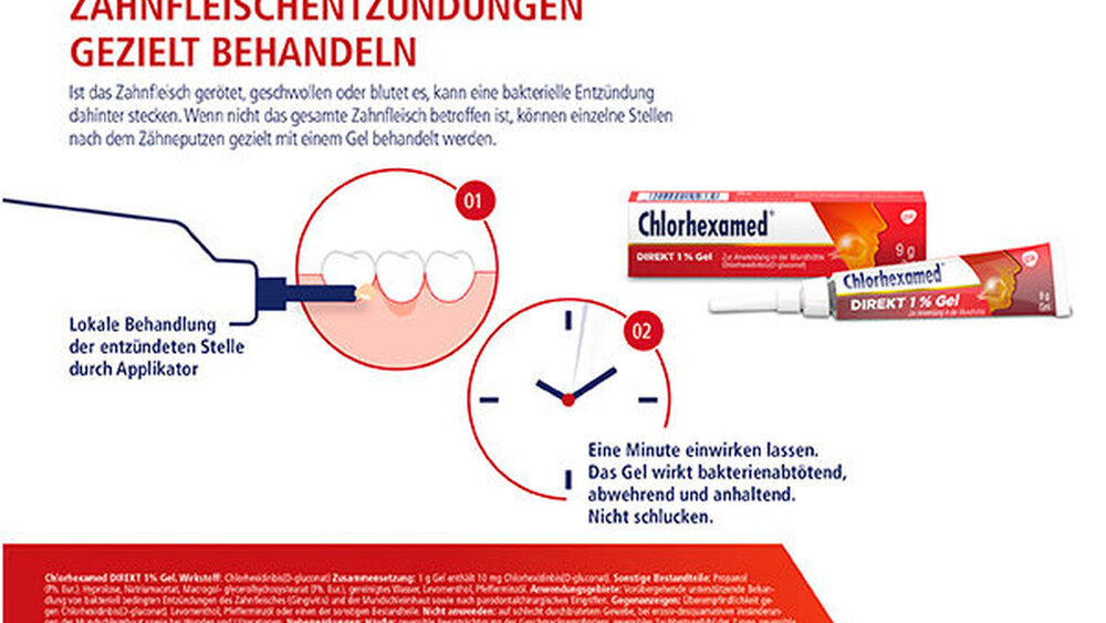 Nicht nur zur unterstützenden Behandlung von Zahnfleischentzündungen und Entzündungen der Mundschleimhaut können Patienten Chlorhexamed DIREKT 1 % Gel verwenden. Auch nach parodontalchirurgischen Eingriffen hilft das Gel, die Keimzahl zu reduzieren und trägt somit dazu bei, die Heilungsphase zu unterstützen.