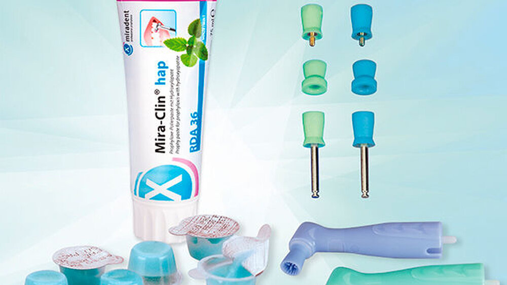 Die fluoridfreie Polierpaste Mira-Clin hap, mit Hydroxylapatit, unterstützt die Behandlung sensibler Zahnhälse und sorgt für eine schonende Entfernung von Belägen und Verfärbungen.