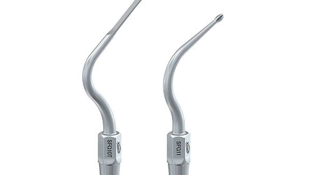 Q steht für Quick, denn mit diesem Anschluss, dem Quick-Gewinde, bieten die beiden Schallspitzen im Handumdrehen noch mehr Komfort am Behandlungsstuhl. Das machte eine Lizenz in Kooperation mit KaVo möglich. Die Eigenschaften der Spitzen bleiben dadurch unangetastet: Die schlanke SF10T mit innovativer spezieller Ösenform ermöglicht auch bei engstehenden Situation oder tiefen Zahnfleischtaschen ein effektives Entfernen von weichen und harten subgingivalen Belägen und wenn gewünscht eine minimalinvasive Glättung der Wurzeloberfläche. Die SF11 erleichtert mit ihrer ausgeklügelten Knospenform die maschinelle Furkationsbehandlung. Die Spitzen sind nicht nur im Komet Schallhandstück SFQ2008L einsetzbar, sondern auch im KaVo SONICflex quick Schallhandstück der Serie 2008/S/L/LS.