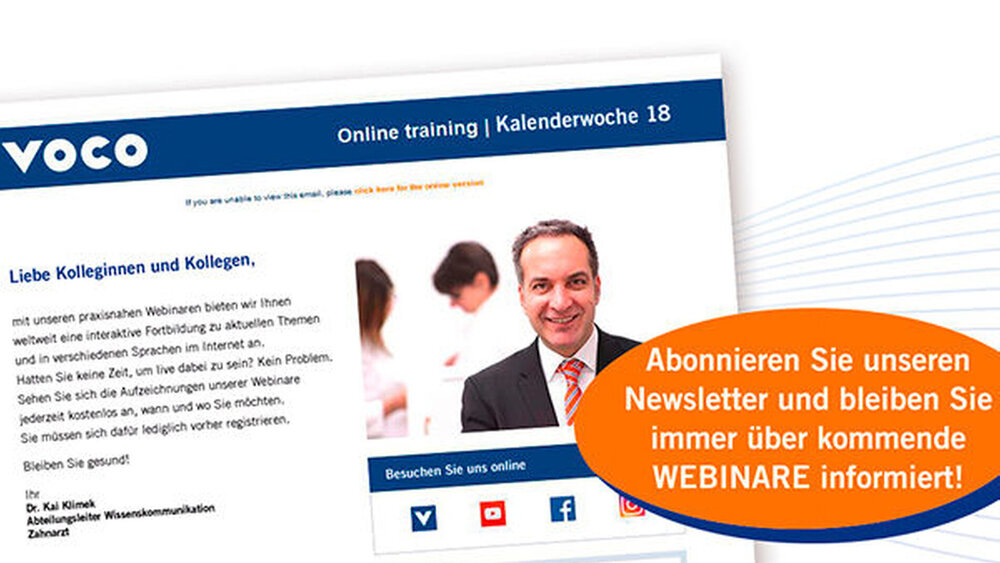 verfügbar. Hier können sich die Zahnärzte auch gleich schnell und unkompliziert anmelden. Wer sich für den VOCO-Newsletter anmeldet, bekommt die Infos zu den Webinaren zudem per Mail wöchentlich in einem Sondernewsletter.