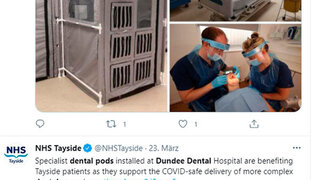 SchottlandNHS finanziert aerosollastige Behandlungen in Zelten Im schottischen Dundee Dental Hospital wurden jetzt Isolationszelte aufgebaut, um aerosollastige Behandlungen – auch im Rahmen der Lehre für Zahnmedizinstudierende – wieder aufnehmen zu können. 20.04.2021 Gesellschaft