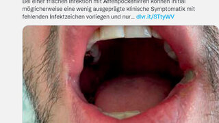 FallberichtOrale Hautbläschen können Affenpockenvirusinfektion anzeigen Wie der Fall eines ansonsten symptomlosen 51-Jährigen zeigt, kann sich eine frühe Infektion mit dem Affenpockenvirus auch durch ein Mundwinkelulkus zeigen. 15.07.2022 Gesellschaft