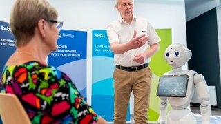 Pilotstudie untersucht Einsatz von mit humanoidem RoboterWas kann Pepper in der Pflege leisten? Der humanoide Roboter Pepper kann mit Menschen interagieren, indem er auf ihre Emotionen reagiert. Eine Pilotstudie untersucht derzeit, was er in der Pflege leisten kann und wie Senioren mit ihm zurechtkommen. 23.07.2024 Gesellschaft