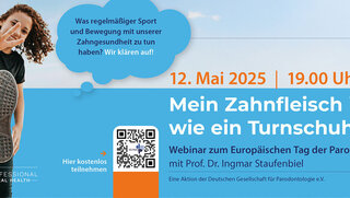 Deutsche Gesellschaft für Parodontologie (DG PARO)Patientenwebinar zum Thema Bewegung und Mundgesundheit Zum Europäischen Tag der Parodontologie am 12. Mai 2025 bietet die DG PARO ein Webinar und eine Laufaktion unter dem Titel „Mein Zahnfleisch ist fit wie ein Turnschuh" für Patienten an. 02.05.2025 Zahnmedizin