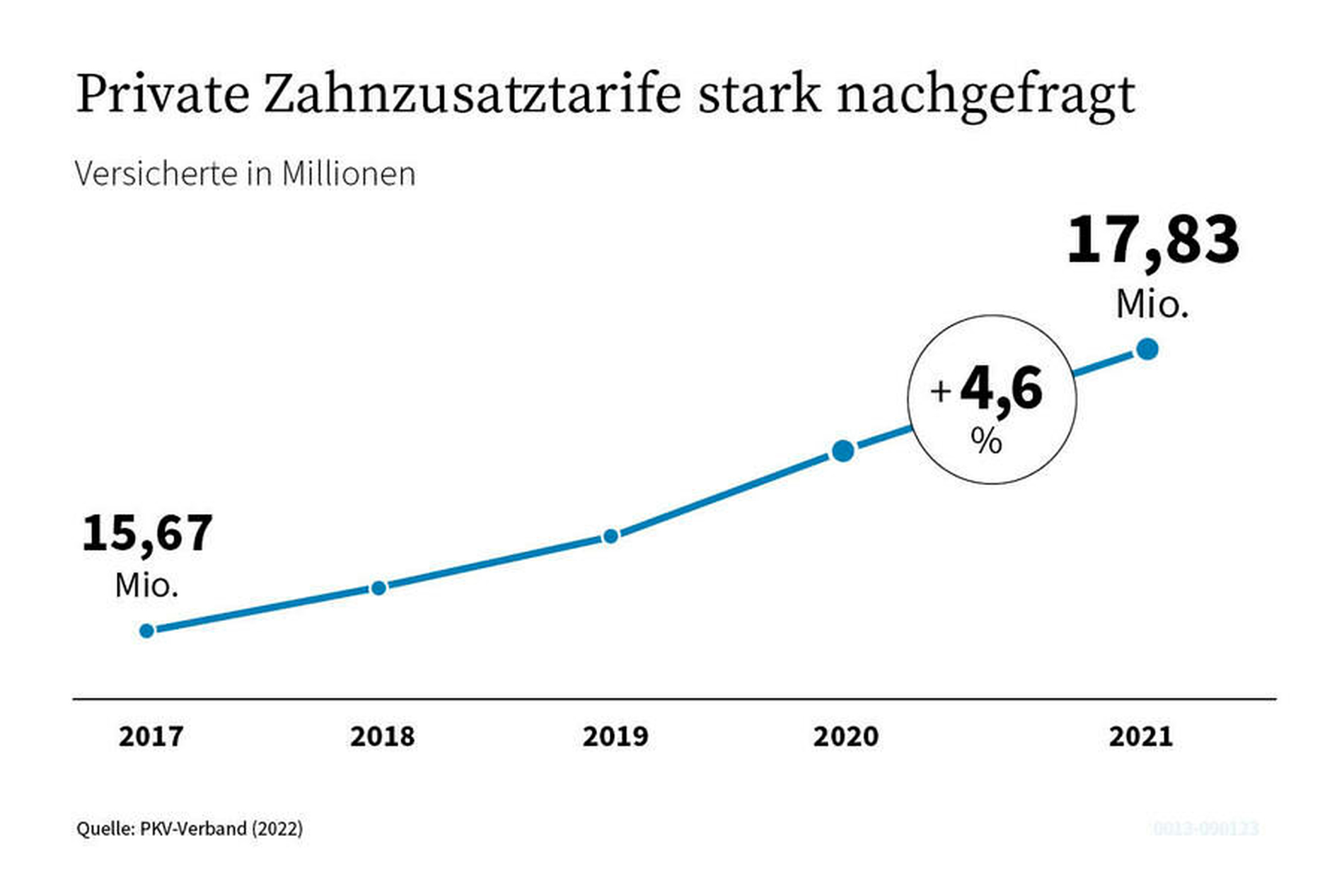 Allein zwischen 2012 und 2021 ist die Zahl Personen mit einem Zahnzusatztarif laut PKV-Verband um 4,3 Millionen oder 30,9 Prozent gewachsen. Insgesamt 13,6 Millionen GKV-Versicherte hatten 2012 eine solche Police.