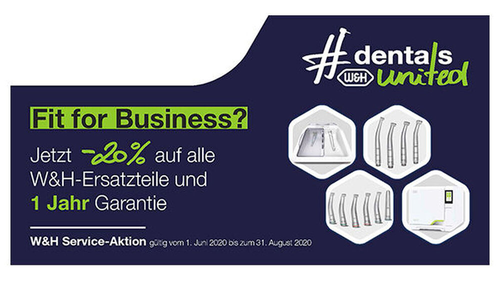Noch nie war die Gelegenheit günstiger, Ihre W&H-Produkte wieder „fit for Business“ machen zu lassen – und dies wortwörtlich. W&H führt alle Reparaturen sowie jährliche Inspektionen und Wartungen im Aktionszeitraum vom 1. Juni bis zum 31. August 2020 mit einem Preisnachlass von 20 Prozent auf den Original-Ersatzteilpreis durch. Bestens ausgebildete Techniker kümmern sich dabei schnell und zuverlässig um Ihre Instrumente und Geräte. Gleichzeitig wird für Sie die Folgegarantie von regulär sechs Monaten auf ein ganzes Jahr verlängert.