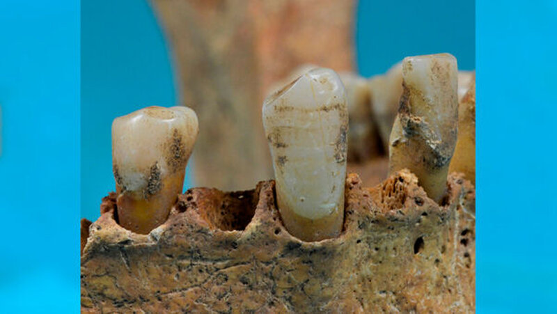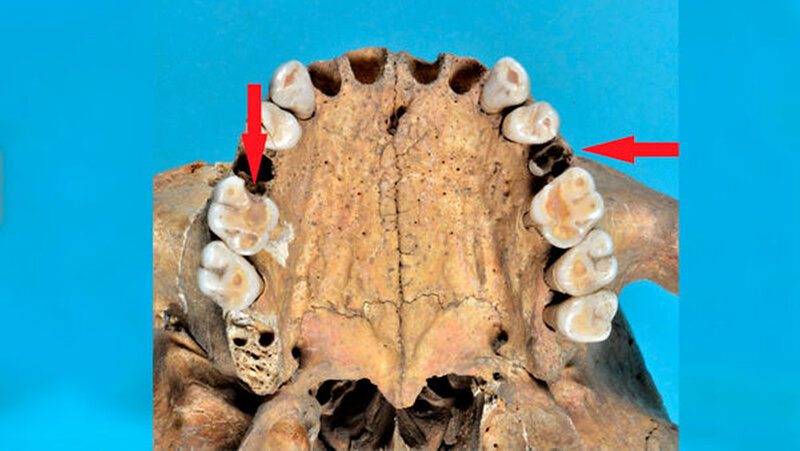 Während die Kariesläsion am Backenzahn relativ klein ist und nicht tief in den Zahn hineinreicht, ist die Krone des zweiten Vorbackenzahnes vollständig zerstört. An den vorhandenen Eckzähnen lassen sich zudem horizontal verlaufende Rillen im Zahnschmelz erkennen.
