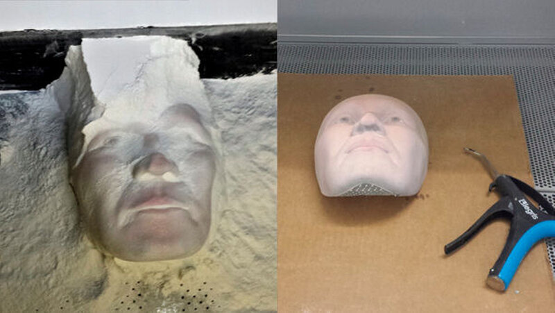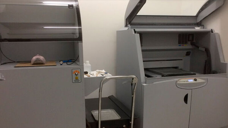 Bei der angewendeten 3-D-Drucktechnik handelt es sich um ein Schichtaufbauverfahren mit speziellem Gipspulver. Im Bauraum wird die Trägerschicht nach und nach in dünnen Lagen zu einem 3-D-Objekt zusammengesetzt. Das überstehende Gipspulver wird mittels einer Walze über den gesamten Bauraum aufgetragen. An den Stellen, die später Bestandteil des Modells sind, wird ein Bindemittel injiziert und die Gipspartikel werden innerhalb einer Schicht und mit der darunterliegenden verklebt. Die Einspritzvorrichtung ähnelt der eines Tintenstrahldruckers. Das nicht verklebte Gipspulver dient als Stützstruktur für weitere Schichten.