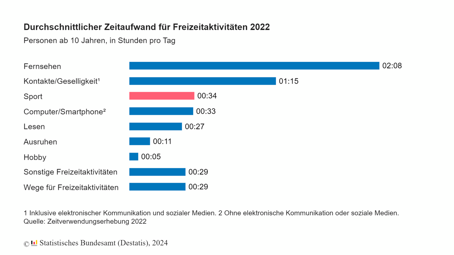 Allerdings: „Gegenüber anderen Freizeitaktivitäten nimmt Sport im täglichen Leben nur eine untergeordnete Rolle ein“. So machen die 34 Minuten insgesamt nur knapp ein Zehntel der Freizeitgestaltung aus, wie aus der Statistik hervorgeht. Die Zahlen stammen aus der Zeitverwendungserhebung 2022 und beziehen sich auf Bürgerinnen und Bürger ab einem Alter von zehn Jahren.
