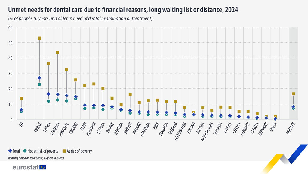 Wie Eurostat meldet, war unter den EU-Ländern der Anteil der Menschen mit ungedecktem Bedarf an zahnärztlicher Versorgung in Griechenland (27,1 Prozent), Lettland (16,5 Prozent) und Rumänien (16,2 Prozent) am höchsten. Am niedrigsten war er in Malta (0,4 Prozent), Deutschland (0,9 Prozent) und Kroatien (1,1 Prozent).