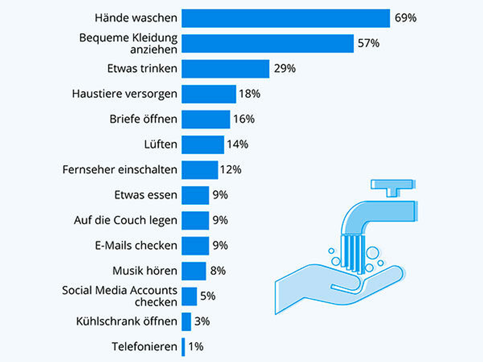 Eine YouGov-Umfrage, die gemeinsam mit Statista durchgeführt wurde, ergab: Insgesamt 69 Prozent der Deutschen waschen sich als Erstes die Hände, wenn sie nach Hause kommen. Frauen (74 Prozent) tun dies noch häufiger als Männer (63 Prozent). Für die Studie wurden 2.097 erwachsene Deutsche vom 5. bis 7. Februar 2021 mittels Online-Interviews befragt