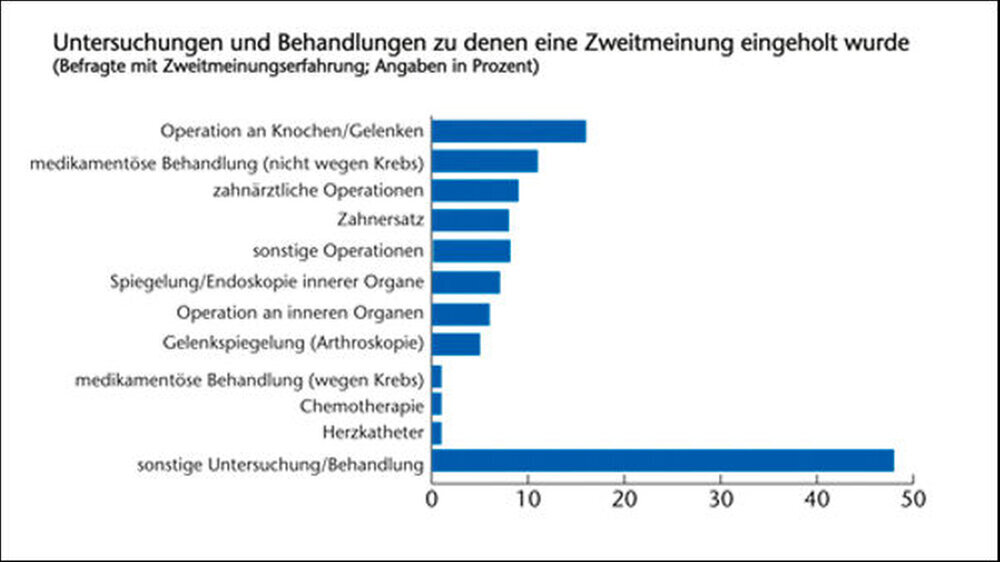 Fast die Hälfte der Patienten mit einer Zweitmeinungserfahrung nutzt diese für andere als die bei der Befragung spezifisch aufgeführten Untersuchungen und Behandlungen: 16 Prozent gaben an, sie bei Operationen an Knochen oder Gelenken eingeholt zu haben; 11 Prozent bei medikamentösen Behandlungen, die nicht wegen einer Krebserkrankung angezeigt waren.