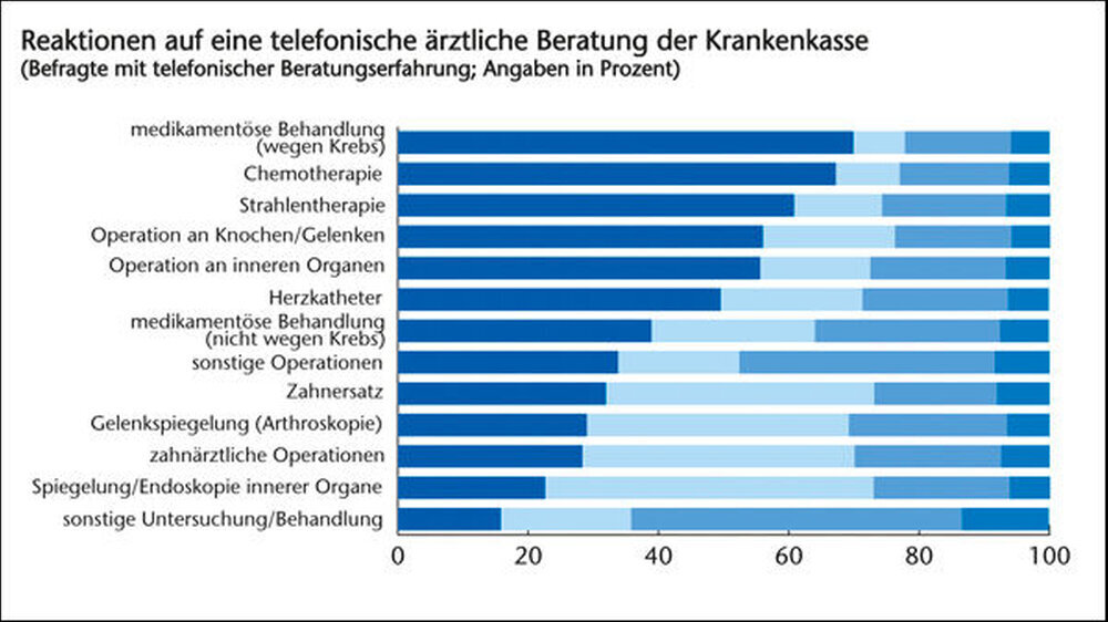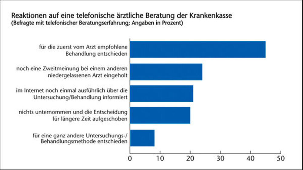 Die Umfrage ergab jedoch, dass eine telefonische ärztliche Beratung der Krankenkasse seltener zu einer Entscheidungsänderung führte als die meist im persönlichen Gespräch wahrgenommene Zweitmeinung. Stattdessen wurde eher das Vertrauen in die Erstmeinung gestärkt: So gaben 34 Prozent der Befragten einer Krankenkassenberatung an, dass das Vertrauen in die ursprüngliche Arztempfehlung sehr viel (neun Prozent) oder etwas größer (25 Prozent) als vor der Beratung war. Für 52 Prozent war das Vertrauen in die Erstmeinung unverändert und nur für 14 Prozent war es etwas (fünf Prozent) oder sehr viel geringer (acht Prozent) als vorher.