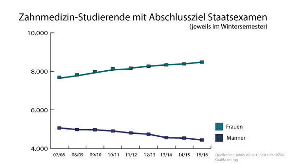 Noch für das Wintersemester 2000/01 weist dasStatistische Jahrbuch der BZÄK 2015/2016ein Verhältnis von 6.557 Frauen zu 6.012 Männern aus, was einem Frauenanteil von 52,2 Prozent entspricht. Dieser entwickelte sich seitdem kontinuierlich zugunsten der weiblichen Studierenden. Im Wintersemester 2015/16 lag er zuletzt bei 65,6 Prozent.