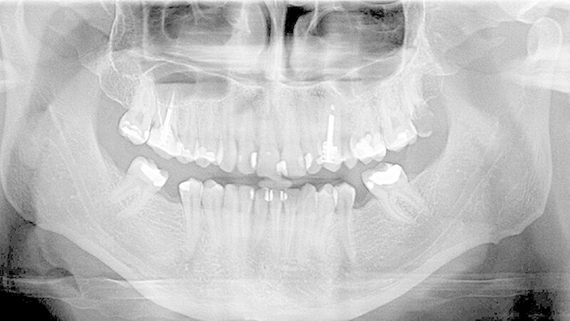 Der 28-jährige Mann wurde von seiner Hauszahnärztin zur Extraktion eines koronal zerstörten 8ers in die oralchirurgische Praxis überwiesen. Ein Röntgenbild wurde nicht mitgeliefert. Erhardt fertigte daher ein OPG an, doch zeigt das (Abbildung 2) nicht, was gleich kommen würde: Am Ende hing ein Doppelwhopper an der Zange!