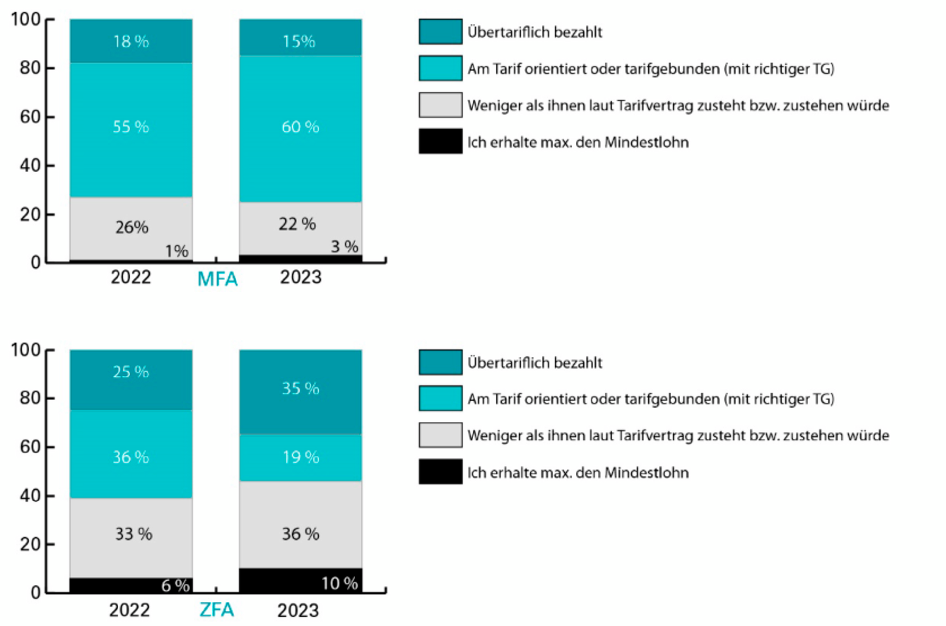 MFA verdienen im Schnitt besser als ZFA. Laut Entgeltaltlas der Arbeitsagentur lag der mittlere monatliche Bruttolohn von vollzeitbeschäftigten MFA im Jahr 2022 bei 2.778 Euro, für ZFA bei 2.382 Euro. Bislang beteiligen sich fünf Kammerbereiche an den Verhandlungen zu einem ZFA-Gehalt nach Tarifvertrag: Hamburg, Hessen, Niedersachsen, Westfalen-Lippe und das Saarland.