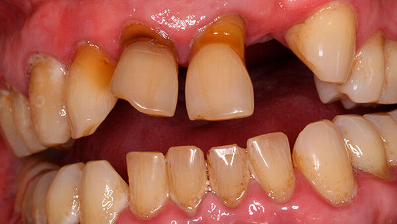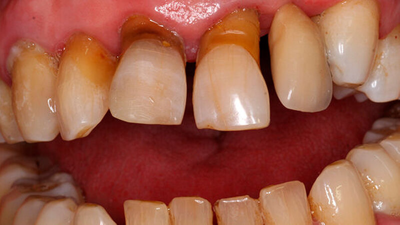Die Versorgung der Frontzahnlücke in Regio 22 wird intensiv mit dem Patienten diskutiert. Aufgrund des absoluten Mangels an ortsständigem Knochen, des hohen Patientenalters sowie der eher mäßigen Mundhygiene scheidet eine Implantation mit Knochenaugmentation aus. Hinzu tritt die starke, vor allem im Frontzahngebiet ausgeprägte Parodontitis. Ein langfristiger Erhalt des endodontisch versorgten 11 sowie des stark parodontal kompromittierten 21 erscheint unrealistisch.