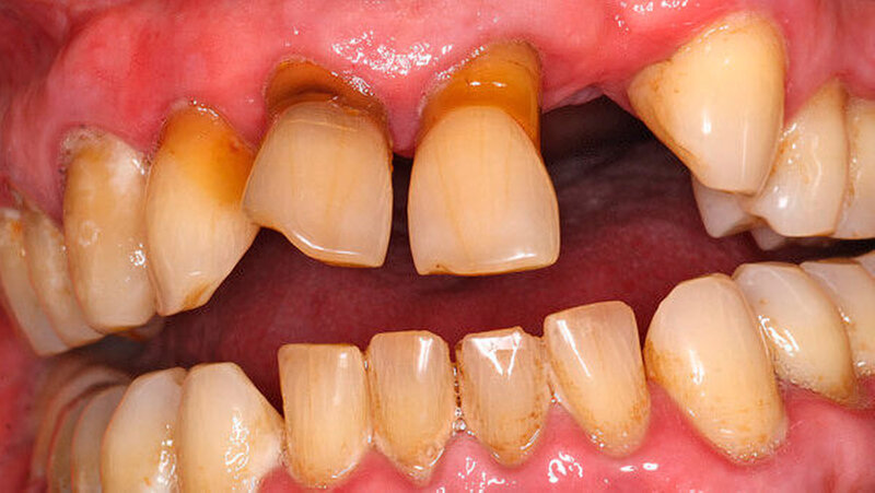 Die Versorgung der Frontzahnlücke in Regio 22 wird intensiv mit dem Patienten diskutiert. Aufgrund des absoluten Mangels an ortsständigem Knochen, des hohen Patientenalters sowie der eher mäßigen Mundhygiene scheidet eine Implantation mit Knochenaugmentation aus. Hinzu tritt die starke, vor allem im Frontzahngebiet ausgeprägte Parodontitis. Ein langfristiger Erhalt des endodontisch versorgten 11 sowie des stark parodontal kompromittierten 21 erscheint unrealistisch.