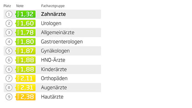 Die Gesamtzufriedenheit wurde dabei errechnet durch die Durchschnittsnote der letzten vier Jahre aus den Kategorien „Zufriedenheit mit Behandlung“, „Zufriedenheit mit der Aufklärung durch den Arzt“, „Beurteilung des Vertrauensverhältnisses zum Arzt“, „Zufriedenheit mit der Freundlichkeit des Arztes“ und „Zufriedenheit mit der genommenen Behandlungszeit“.
