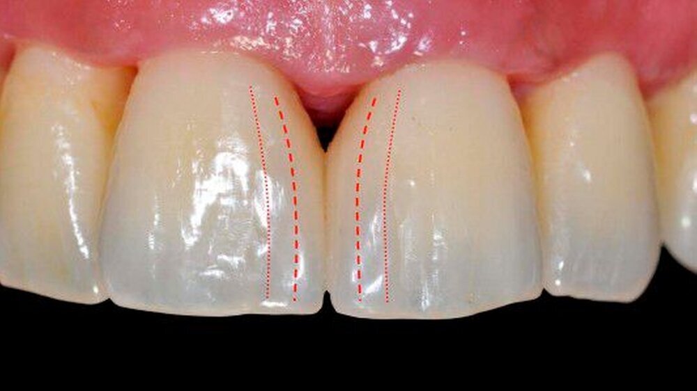 Die klinisch einfacher zu meisternde Herausforderung ist der klassische Diasthemaschluss. Hierbei werden die Zähne auf der ganzen Länge der klinischen Krone ziemlich gleichmäßig verbreitert. Eine Änderung der Grundform ist in der Regel weder notwendig noch erwünscht. Zu diesem Zweck muss durch die Restauration die Randleiste des Zahnes im Sinne einer Parallelverschiebung ohne Änderung der Krümmung auf den Nachbarzahn, bzw. die Lücke zu verlegt werden. Erfolgt diese Verschiebung nicht und die Lücke wird einfach nur geschlossen, so stimmt anschließend die Zahnform nicht mehr, da die Randleiste zu weit zum Zentrum der Labialfläche platziert ist und eben nicht am Rand liegt, wo sie hingehört (Abb. 2a und b).