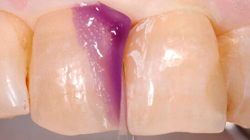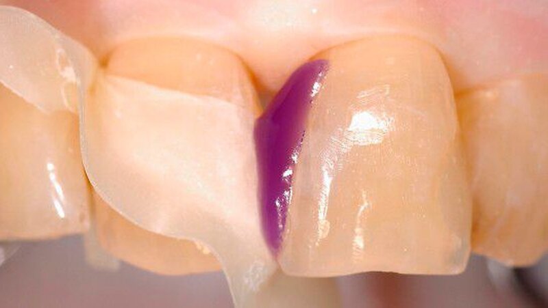 Bei der Auswahl der Kompositmassen für den Diasthemaschluss gibt es wiederum eine einfache Regel: Bei kleinen Lücken, die nicht breiter als zwei Millimeter sind, pro Zahn also maximal um einen Millimeter verbreitert werden muss, wird ausschließlich Schmelzmasse verwendet. Ist das Diasthema breiter als zwei Millimeter, muss pro Zahn also mehr als ein Millimeter verbreitert werden, so sollte zuerst eine Dentinmasse appliziert werden, die anschließend mit einer Schmelzschicht überzogen wird. Käme bei diesen breiteren Lücken nur Schmelzmasse zum Einsatz, so würden die Aufbauten unweigerlich zu transparent und erschienen vor dem dunklen Hintergrund der Mundhöhle zu grau und zu dunkel. Dabei sollte die Dentinmasse ebenfalls dünn auslaufend auf die Labialfläche herum gezogen werden, um die Transparenz des natürlichen Schmelzes abzumildern. Überlagert man den Bereich des natürlichen Schmelzes nicht mit etwas Dentinmasse, besteht die Gefahr, dass die Restauration hinterher streifig wirkt. Dieser Eindruck entsteht durch den Wechsel von natürlicher Opazität (Dentin des Zahnes), gefolgt von natürlicher Transparenz (echter Schmelz), dann der Opazität der Dentinmasse und zuletzt wieder der Transparenz der Schmelzmasse des Komposits (Abb. 4a – 5b).