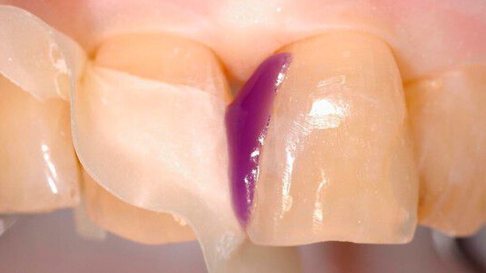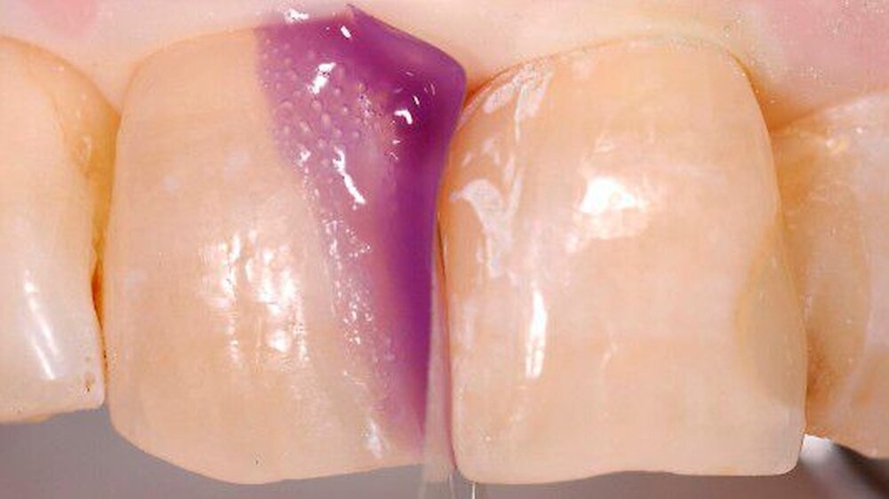 Um diese Parallelverschiebung zu bewerkstelligen, sollte das Komposit nicht nur approximal aufgetragen werden, sondern dünn auslaufend bis auf die vestibuläre Fläche des Zahnes gezogen werden. So wird das notwendige Volumen geschaffen, um die Randleiste zu verlegen, während gleichzeitig das dünn auslaufende Komposit den Farbübergang verbessert (Abb. 3a und b).