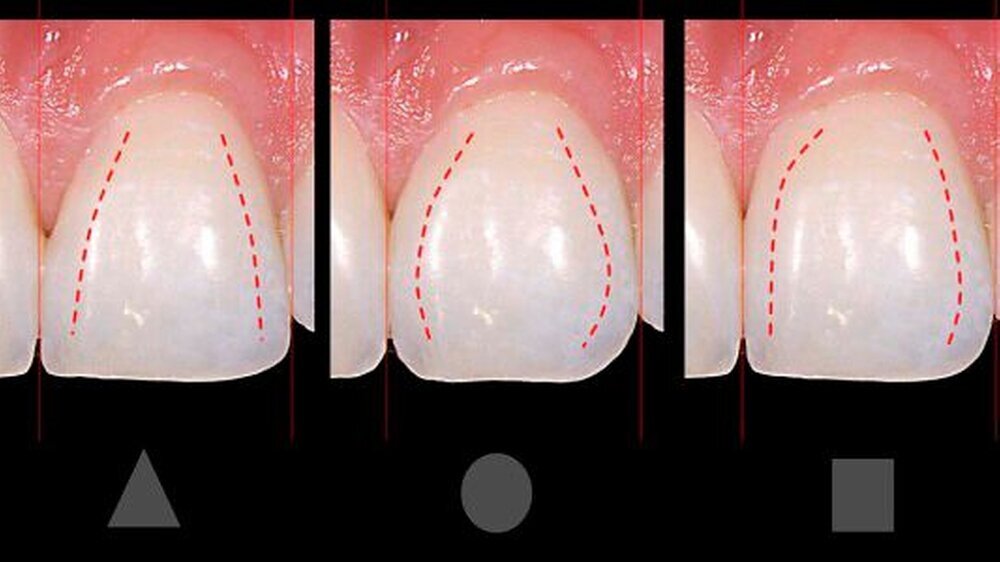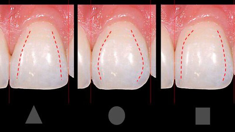 Schon früh wurde der entscheidende Einfluss der Randleisten auf die Grundform und somit das Gesamterscheinungsbild des Frontzahnes festgestellt. Bei gleicher Zahnbreite wurden so verschiedene Grundtypen der Schneidezahnformen definiert: dreieckig, rechteckig und ovoid. Bei einer dreieckigen Grundform sind die Randleisten meist gerade. Bei rechteckigen Zähnen weisen die Randleisten im zervikalen Drittel eine Wölbung zu den Nachbarzähnen hin auf, während der ovoide Typ eine mehr oder weniger gleichmäßige Wölbung über die ganze Kronenlänge zeigt (Abb. 1).