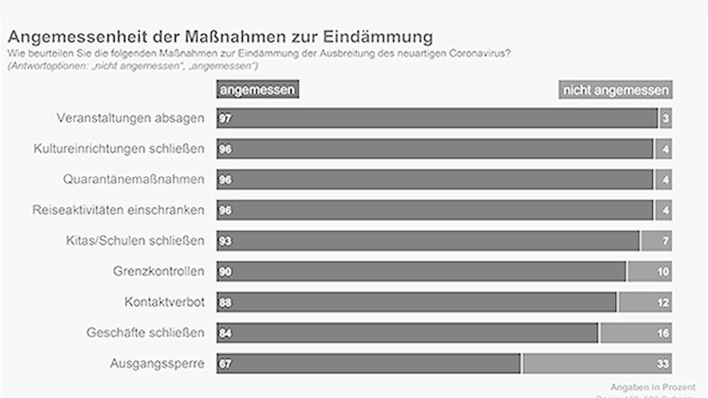 Allerdings sind weniger Menschen bereit, die Eindämmungsvorschriften zu unterstützen. Während das Absagen von Veranstaltungen, das Einschränken von Reisen sowie Quarantänemaßnahmen weiterhin von mehr als 90 Prozent der Befragten als angemessen bewertet wurden, sanken die Akzeptanz der Ausgangssperre und des Kontaktverbots von 88 Prozent auf 67 Prozent.