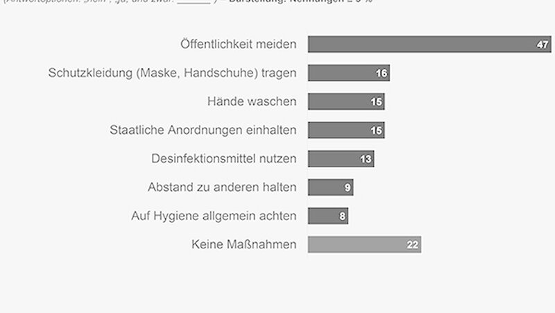 Das Meiden der Öffentlichkeit ist laut repräsentativer Befragung des BfR nach wie vor die am häufigsten spontan genannte Schutzmaßnahme (47 Prozent), wobei die Bedeutung von Schutzkleidung (16 Prozent) - Masken oder Handschuhen - und von Desinfektionsmitteln (29 Prozent) steigt. Zugleich sank der Anteil der Befragten, die sich nicht sicher sind, dass sie sich vor einer Ansteckung schützen können, im Vergleich zur Vorwoche auf 29 Prozent.