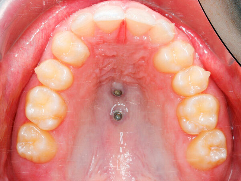 Das zweiphasige Vorgehen wird anhand eines 15-jährigen Patienten mit Aplasie beider oberer seitlicher Schneidezähne dargestellt (Abbildung 1). Die bleibenden oberen Eckzähne waren nach mesial gewandert, während die Milcheckzähne noch persistierten. Von Eltern und Patient wurde der kieferorthopädische Lückenschluss, möglichst mit Alignern, gewünscht. Die Behandlung begann mit dem Anpassen kieferorthopädischer Bänder auf den oberen ersten Molaren sowie der Insertion von zwei Mini-Implantaten (2 x 9 mm und 2 x 7 mm, Benefit, PSM) posterior der dritten Gaumenfalten in der sogenannten T-Zone [Becker, 2019; Wilmes, 2016]. Die Verbindung zu den Prämolaren wurde durch Gleitröhrchen (Tubes) und Klebeverbindungen mittels Composite realisiert (Abbildung 2, B-Mesialslider, [Wilmes, 2018]). Die Milcheckzähne wurden erst unmittelbar nach Einsetzen des Mesialsliders extrahiert, um die Geschwindigkeit des Lückenschusses zu erhöhen (Regional Accelatory Phenomenon – RAP [Verna, 2016]). Nach insgesamt zwölf Monaten sind alle Lücken nach mesial geschlossen (Abbildungen 3 und 4).