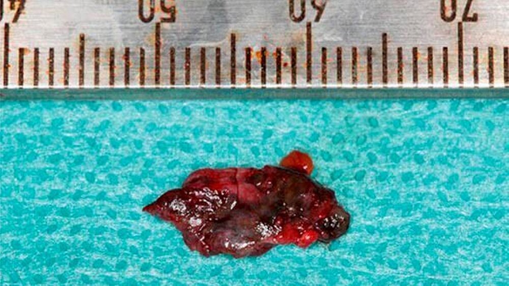 Im Zuge der Sanierung wurde der Zahn 24 extrahiert und nach 5 Monaten ein Titanimplantat inseriert. Die Amalgamtätowierung regio 47 wurde chirurgisch exzidiert (Abb. 4). In der pathologischen Untersuchung zeigte sich ein Fettbindegewebsstück mit Nachweis von schwarz-braunem Fremdmaterial mit umgebend ausgeprägter Fibrose und Sklerose sowie herdförmiger Kalzifikation neben einer mäßiggraden chronischen Entzündungsreaktion. Die definitive Versorgung der Zähne erfolgte mit Vollkeramikkronen, die mit einem Glasionomerzement befestigt wurden.