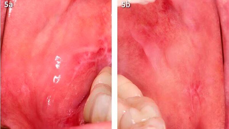 In den Nachuntersuchungen sechs Monate nach Entfernung der Amalgamfüllungen zeigte sich ein deutlicher Rückgang der lichenoiden Effloreszenzen (Abb. 5a, b). In regio 47 distal bestand ein retikulärer Lichen planus. Die plaqueartigen Inseln im Planum buccale und die großflächigen Wickham-Streifungen sind weitgehend zurückgegangen. Die Patientin befindet sich weiterhin in einem engmaschigen Recall.
