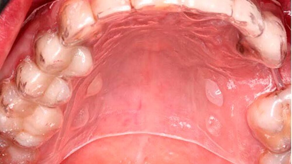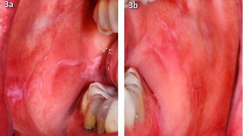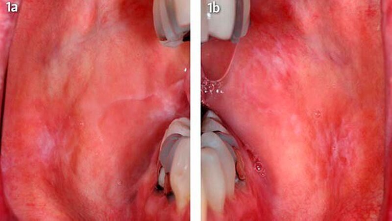 Um eine mögliche Unverträglichkeit der alternativ infrage kommenden Dentalmaterialien auszuschließen, wurde zusätzlich eine intraorale Verträglichkeit mithilfe einer speziell individuell angefertigten Schiene im Oberkiefer durchgeführt (Abb. 2). Zunächst erfolgte ein schrittweiser Austausch der Amalgamfüllungen durch provisorische Glasionomerzementfüllungen (Abb. 3a, b). Es kam zu einem deutlichen Rückgang der lichenoiden Reaktionen im Planum buccale sowie der Zungenränder.
