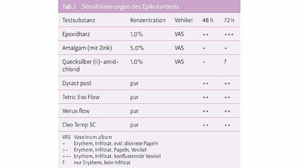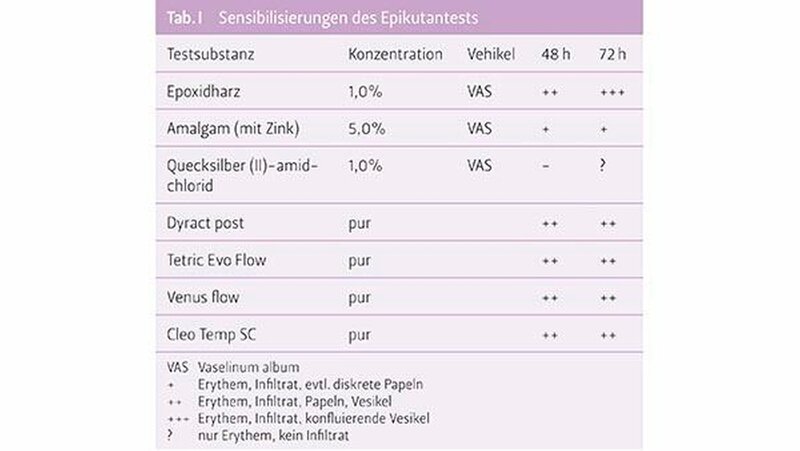 Dieser Befund passte zu einer erosiv-entzündlichen Veränderung der Mukosa. In der Biopsie der Wangenregion rechts zeigte sich eine geringradig regeneratorische Epithelhyperplasie. Als Diagnosen wurden ein kombiniert retikulär-erosiver Lichen sowie eine lichenoide Kontaktläsion regio 47 und eine Einlagerung von exogenen Pigmenten («Amalgamtätowierung») in regio 47 beschrieben. Vor einem Austausch der Füllungen wurde der Patientin eine erneute Epikutantestung empfohlen. Hier fand sich eine polyvalente Sensibilisierung zusätzlich auf Epoxidharz, Amalgam (mit Zink) und Quecksilber (II)-amid-chlorid sowie vier der getesteten Proben (Tab. 1).