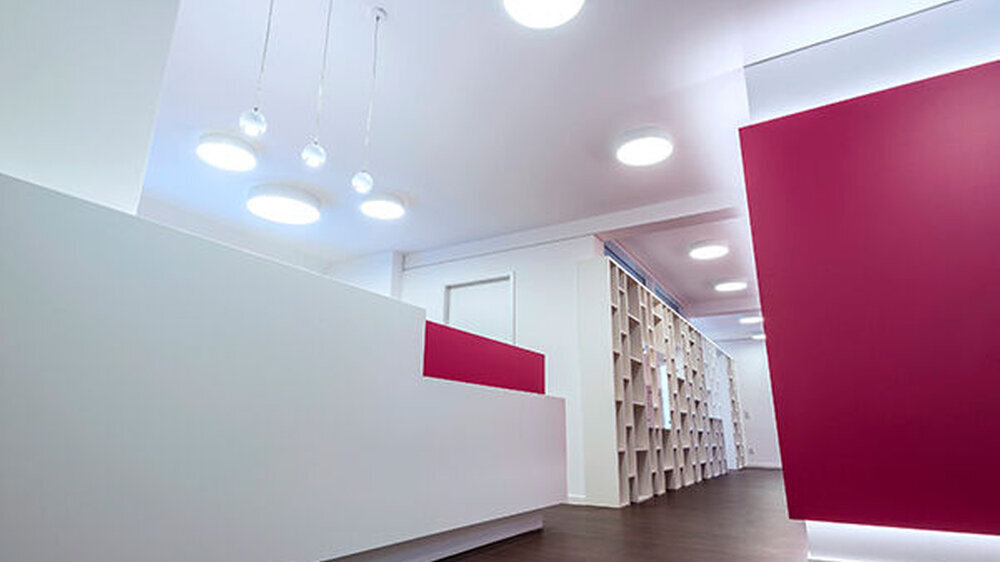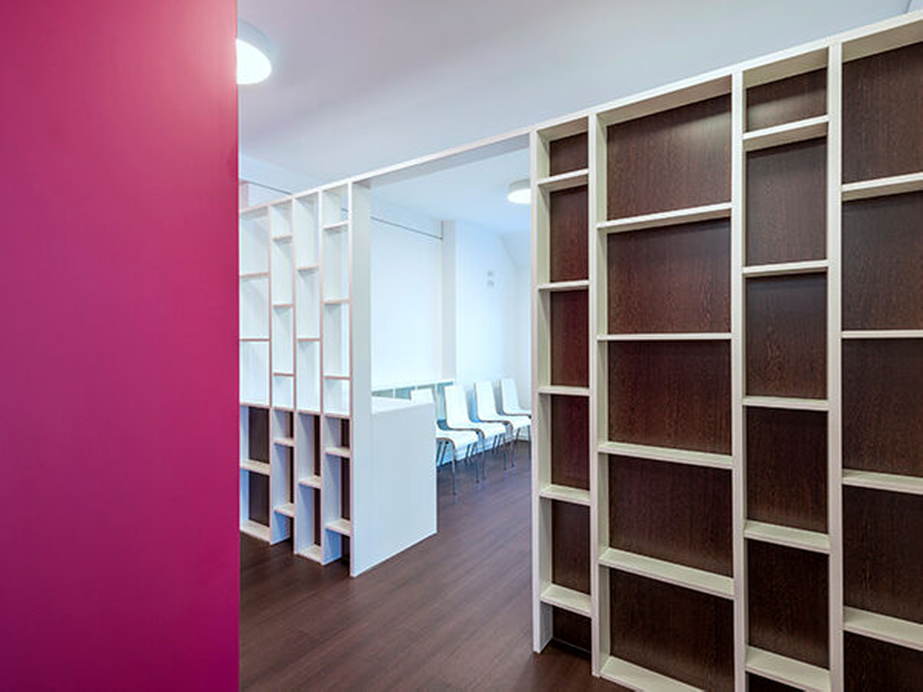 Highlight der Praxis ist der große Behandlungsraum mit bodentiefen Fenstern und direktem Blick auf die Würm. Der markante Fußboden in Wengeoptik bildet eine kraftvolle Basis, auf der einzelne Objekte in der Akzentfarbe Fuchsia besonders zur Geltung kommen. Alle weiteren raumbildenden Elemente und Funktionsmöbel nehmen sich zurück und sorgen durch ihre weißen Oberflächen für eine helle und hygienische Atmosphäre.