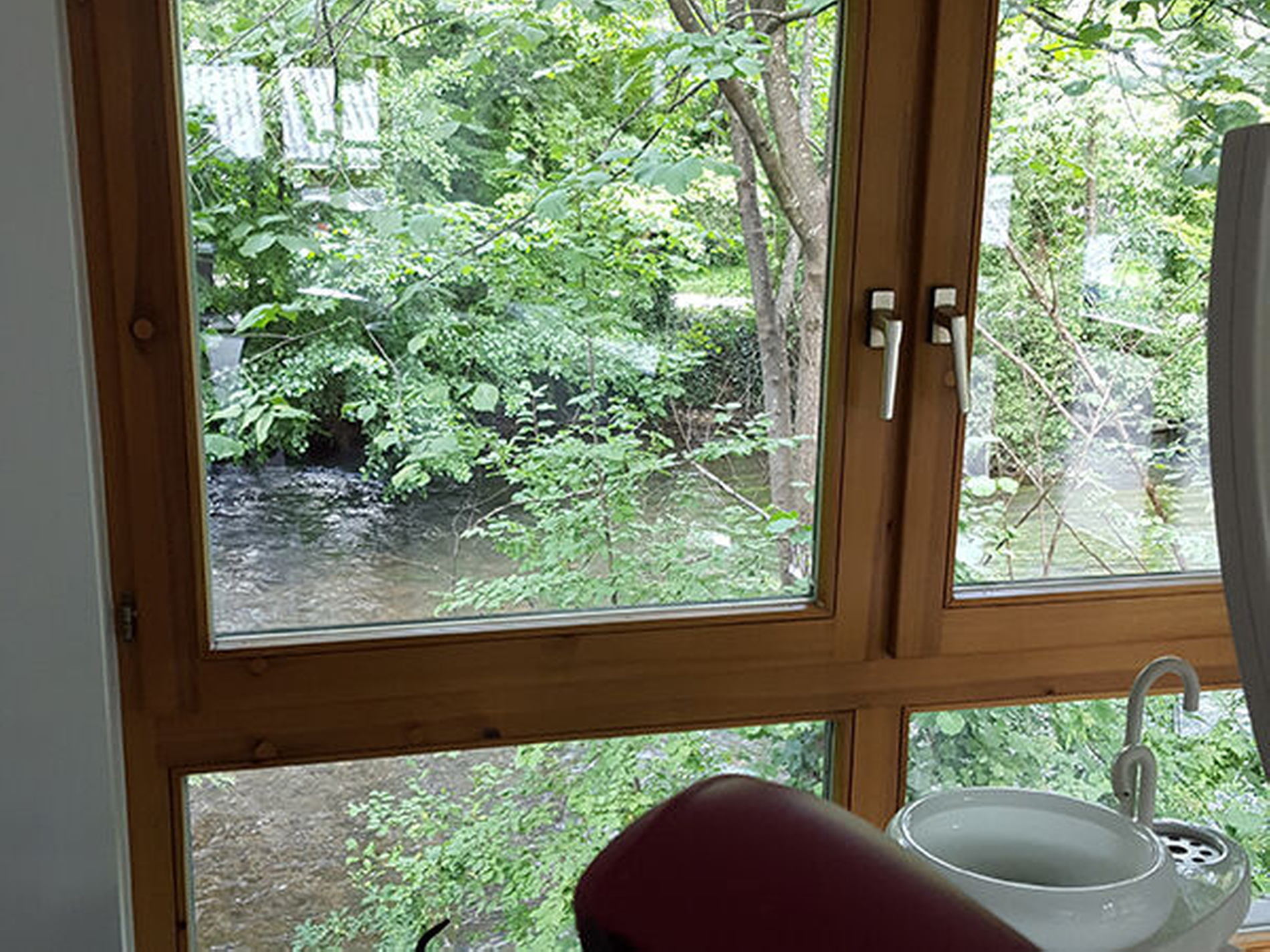 "Ich wollte diese Räume gerne haben, weil der Blick aus Wartezimmer und Behandlungsraum direkt auf die Würm geht", sagt Stephanie Schmidt. Auch der Charme des alten Gebäudes hat es ihr angetan: Ursprünglich war das Gebäude ein Bauernhof - ganz, ganz früher ein Ort, an dem Leder gegerbt wurde. Schmidt: "Unsere Praxis besteht seit Dezember 2016 und ich versuche, die Kieferorthopädie ganzheitlich zu betrachten. Der Begriff "Alles im Fluss" passt hier ziemlich gut."