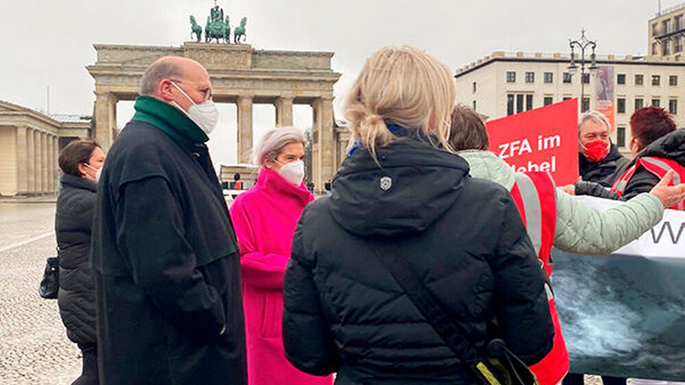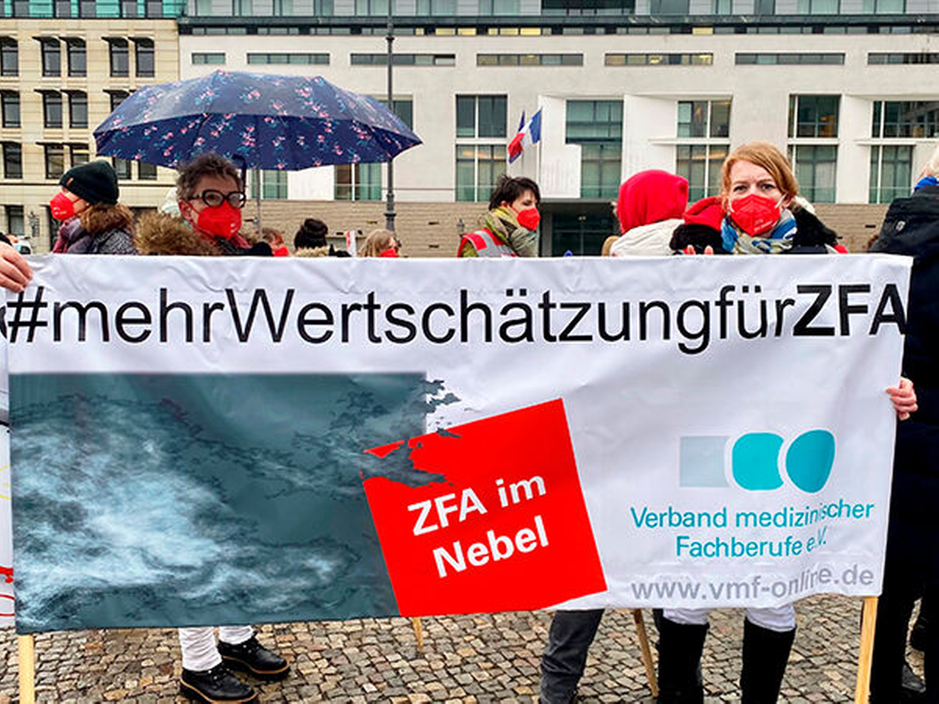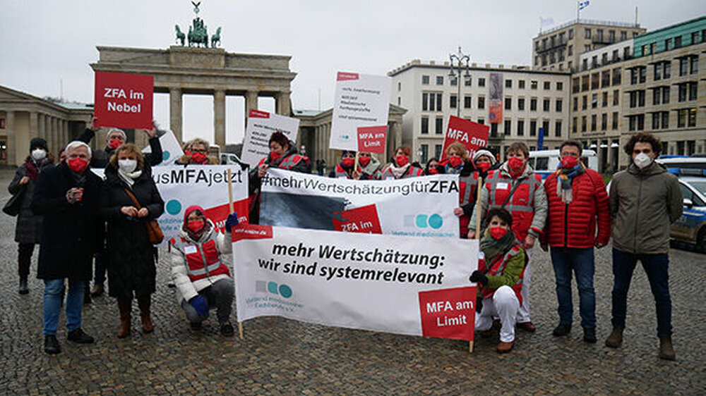 Während die Regierung an diesem Nachmittag im Bundestag gegenüber noch über die mögliche Einführung einer allgemeinen Impfpflicht debattiert, versammeln sich ein weiteres Mal Mitarbeiter und Mitarbeiterinnen aus den niedergelassenen Praxen zusammen mit Vertreterinnen vom VmF am Brandenburger Tor in Berlin.