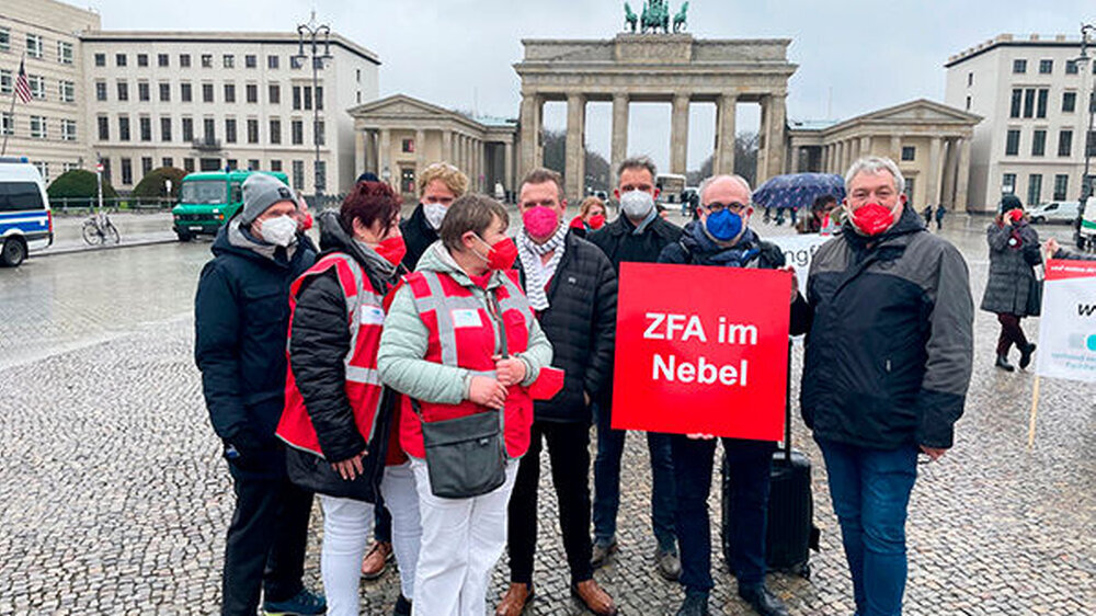 Zur Übergabe der vom VmF gesammelten Protestbriefe der ZFA und MFA an das Bundesgesundheitsministerium kam es gestern Nachmittag in Berlin nicht mehr: Die Protestaktion musste zum Ende hin aus Sicherheitsgründen abgebrochen werden. Im Anschluss an die Versammlung wollten sich VmF-Präsidentin Hannelore König und einige Teilnehmer eigentlich auf den Weg zur Friedrichstraße machen. Doch die zuständigen Polizeibeamten der Hundertschaft rieten davon dringend ab.