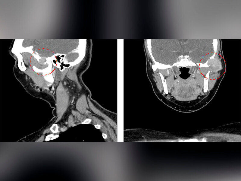 In der durchgeführten CT-Untersuchung mit Kontrastmittel (Abbildung 1) zeigte sich in der linken Gelenkpfanne des Kiefergelenks ein unscharf und destruierend wachsender Tumor mit einem maximalen Durchmesser von etwa 3 cm. Der Tumor arrodierte das Felsenbein und einzelne Mastoidzellen. Die knöcherne Begrenzung der mittleren Schädelgrube zeigte sich nach intrakraniell aufgehoben und die Dura mater zum angrenzenden Temporallappen wurde bereits nach medial verdrängt. Der linke Jochbogen zeigte sich ebenfalls knöchern destruiert, das linke Kiefergelenkköpfchen war jedoch intakt. Im MRT zeigten sich neben einer Tumorinvasion des Musculus temporalis auch ipsilateral links intra- und paraparotideale Lymphknoten, die im Seitenvergleich vermehrt imponierten (Größe < 1 cm). Im Level IIb links zeigten sich im Seitenvergleich ebenfalls vermehrt Lymphknoten, allerdings ohne einen konkreten morphologischen Malignitätsverdacht.