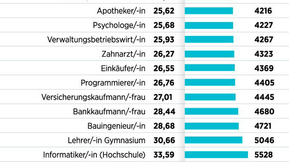 BamS beruft sich dabei auf eine Untersuchung der Bundesagentur für Arbeit zu Entgelten für sozialversicherungspflichtig Beschäftigte. Das Blatt nennt das Bruttogehalt pro Monat und die Bruttostundenlöhne auf Basis einer 38-Stundenwoche.